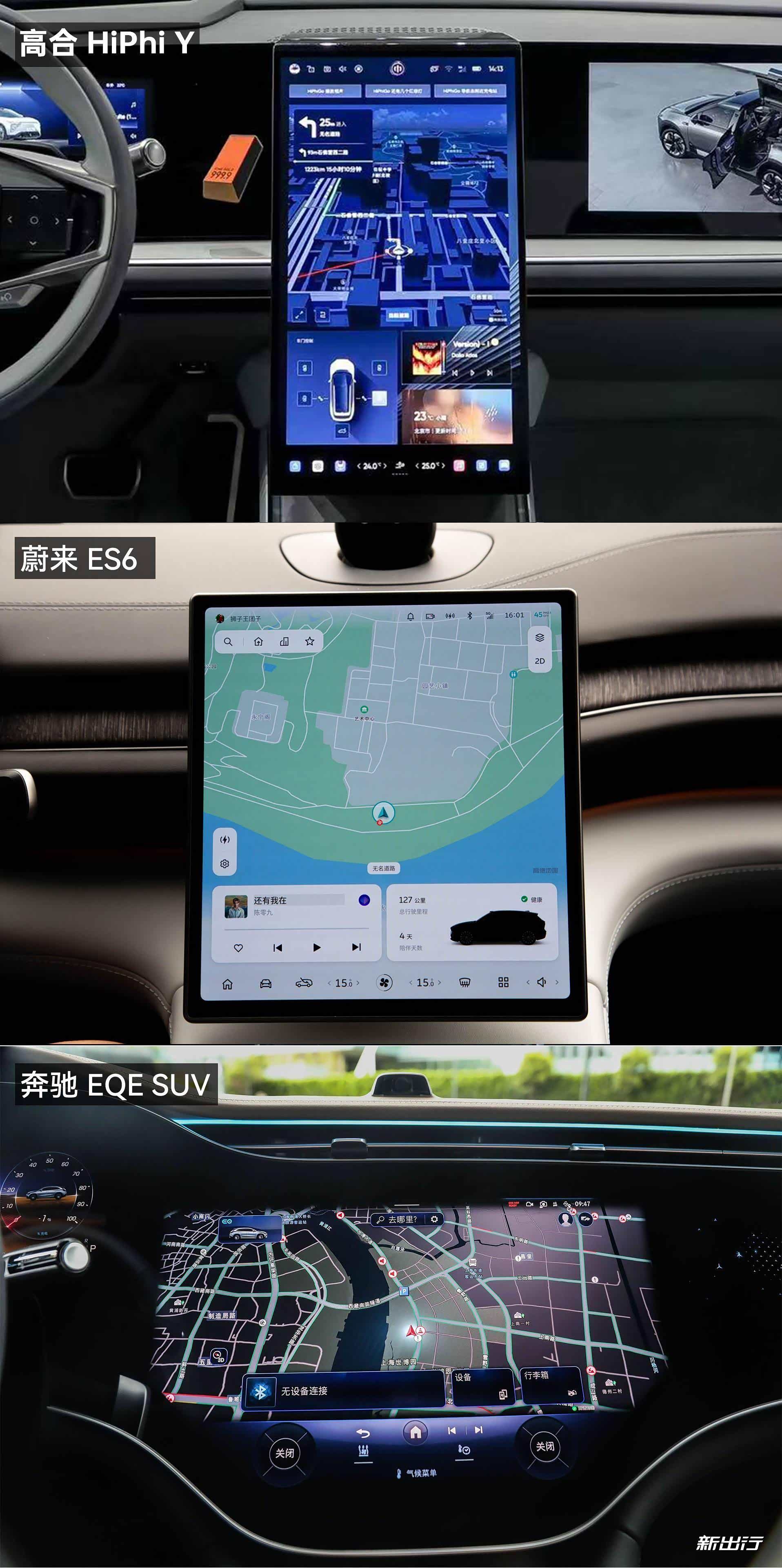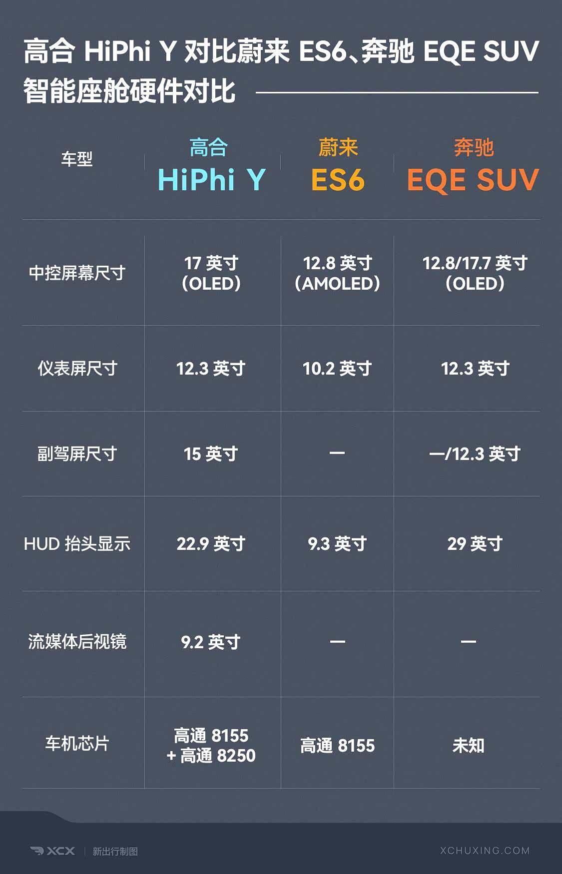 在芯片硬件配置上,高合 HiPhi Y 采用了高通 8155 芯片+高通 8250 双芯片方案;蔚来 ES6 采用了高通 8155 单芯片方案;奔驰 EQE SUV 尚未公布。