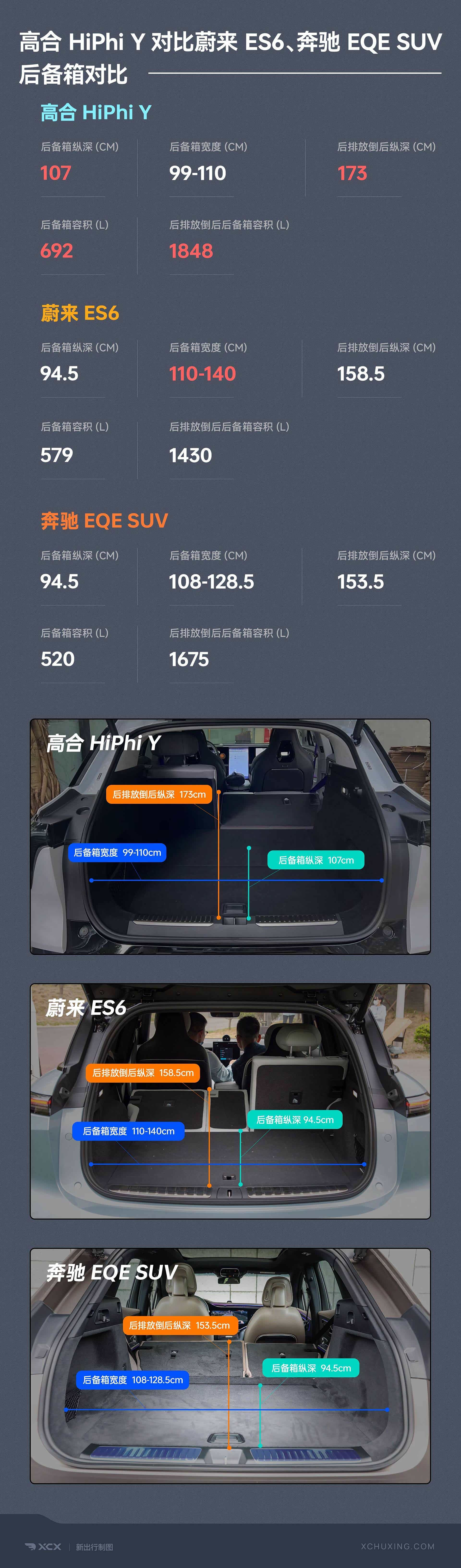 那么根据官方实际的容积来看也是如此,高合 HiPhi Y 、蔚来 ES6、奔驰 EQE SUV 后备箱常规状态下的容积分别为 692L、579L、520L;后排放倒后后备箱容积分别为 1848L、1430L、1675L。