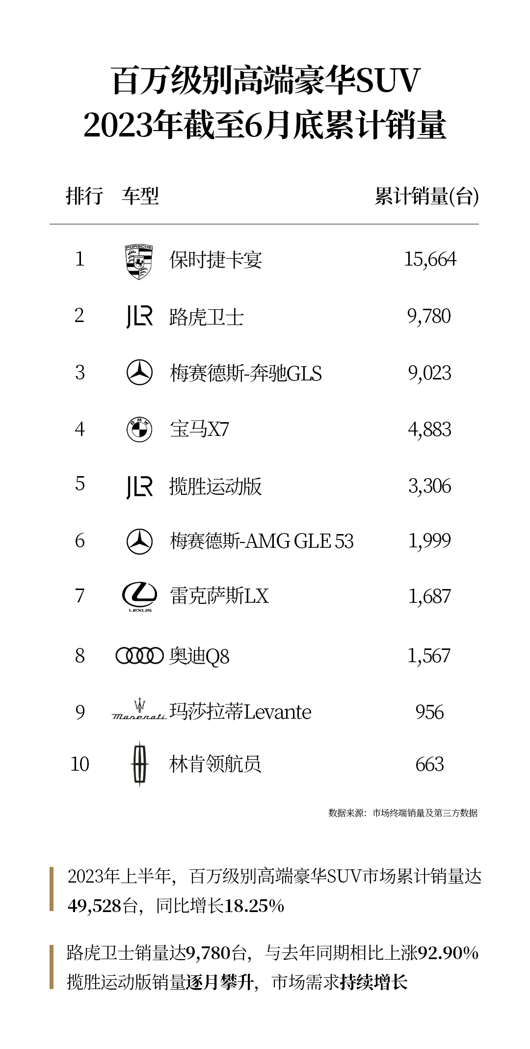 更加讽刺的是,高端豪华市场又是另一番景象,与这种内卷行为形成了鲜明对比。根据最近的一则数据显示,上半年百万级高端SUV市场累计销量达49528台,同比增长18.25%,150万及以上高端豪华SUV市场累计销售16466辆,同比增长51.67%。更让人想不到的是,一向不显山不露水的捷豹路虎竟然成为最大赢家!