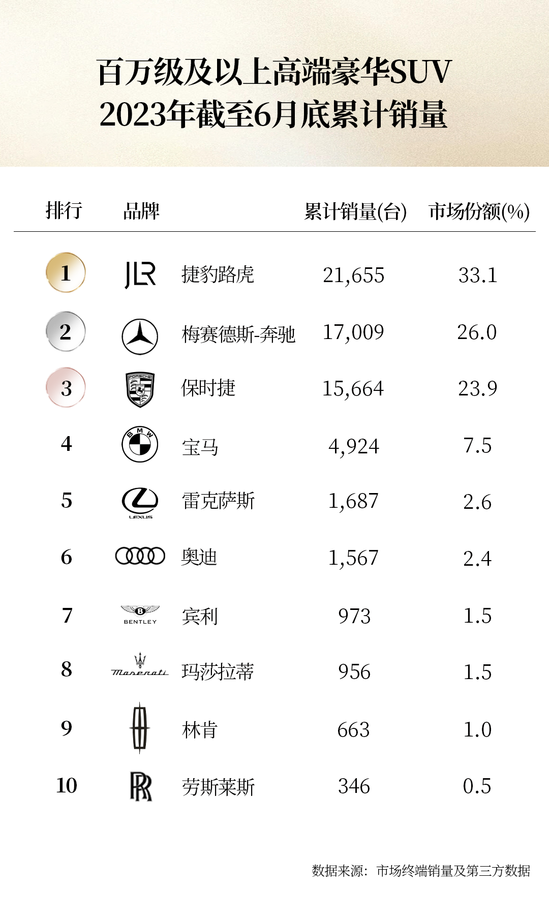 在百万及以上的高端SUV品牌销量榜单中,捷豹路虎累计销售了21655辆新车,市场份额达到33.1%,大幅领先第二名的梅赛德斯奔驰(17009辆,市场份额26%)和第三名的保时捷(15664辆,市场份额23.9%)。