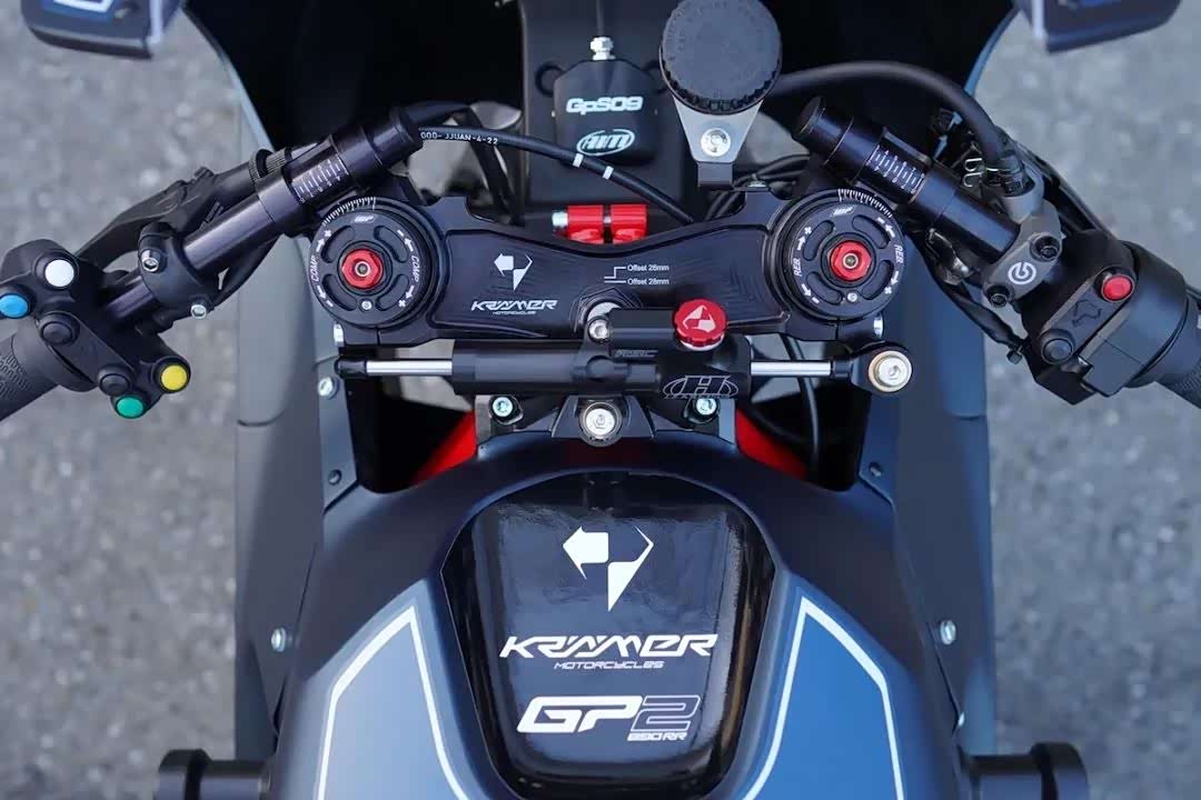 Kramer GP2-890RR是一款限量版的赛道车型,面向全球市场提供125辆,每辆车的独特编号都刻在上联板上。这种级别的摩托车,自然会配备各种顶级组件,包括双Brembo Stylema卡钳、锻造铝Dymag车轮和顶级 WP Apex Pro悬架。