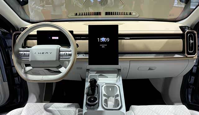 奇瑞汽车的内饰并未延续其一贯的设计理念,而是通过大量横向线条和两块屏幕(纵置大尺寸中控液晶屏和全液晶仪表盘),以及粗壮的电子挡杆和方形出风口的设计,营造出一种强硬的氛围,彰显出科技感。