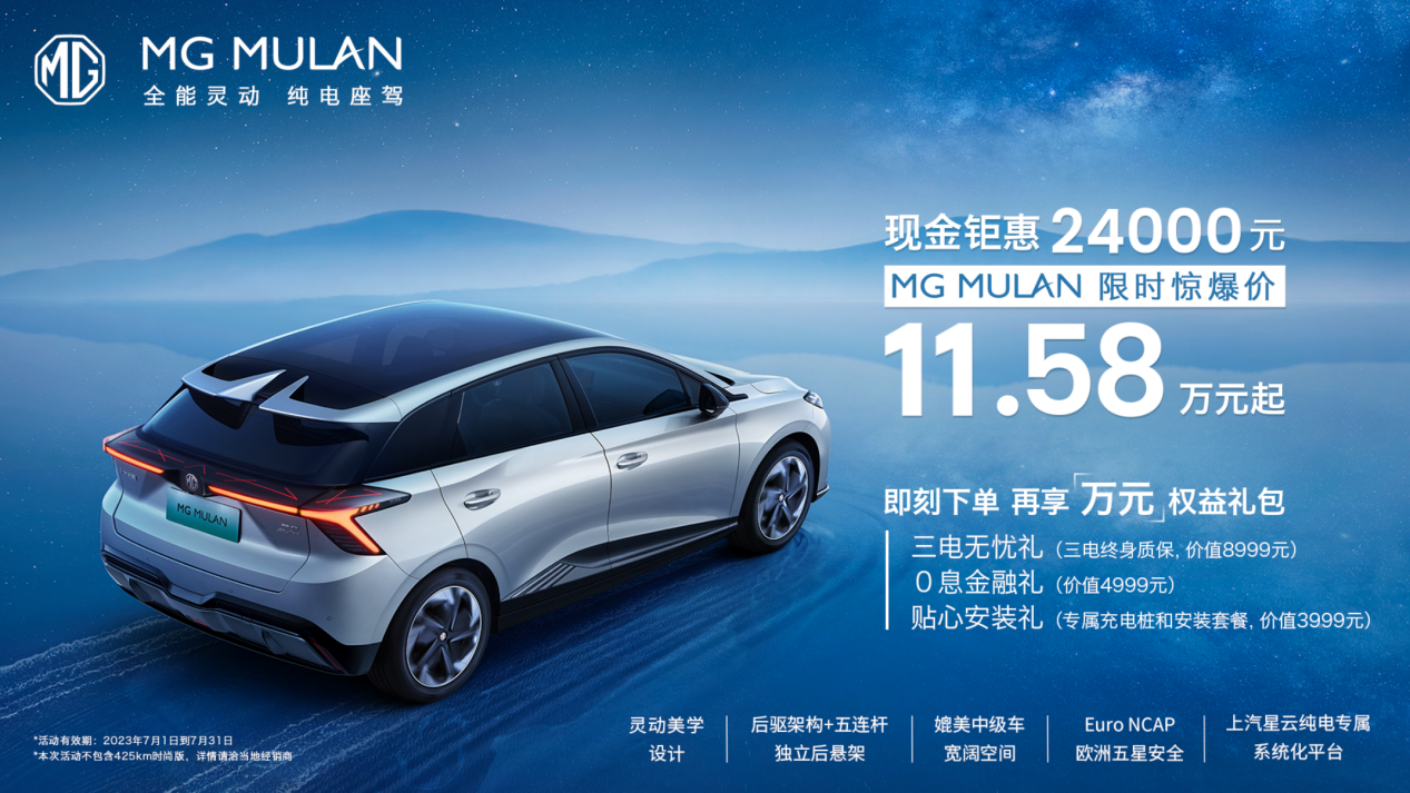 最后再聊一下大家很关心的价格,MG MULAN在欧洲的售价约合人民币25万左右,我感觉这个价格与它的品质是比较吻合的。不过面对内卷的国内纯电车市场,MG MULAN放出了大招,在本身就不高的定价基础上继续加码,推出了7月限时优惠活动。现在入手MG MULAN可享受24000元现金钜惠,限时惊爆价11.58万元起,而且还有价值万元的权益大礼包可以领取。