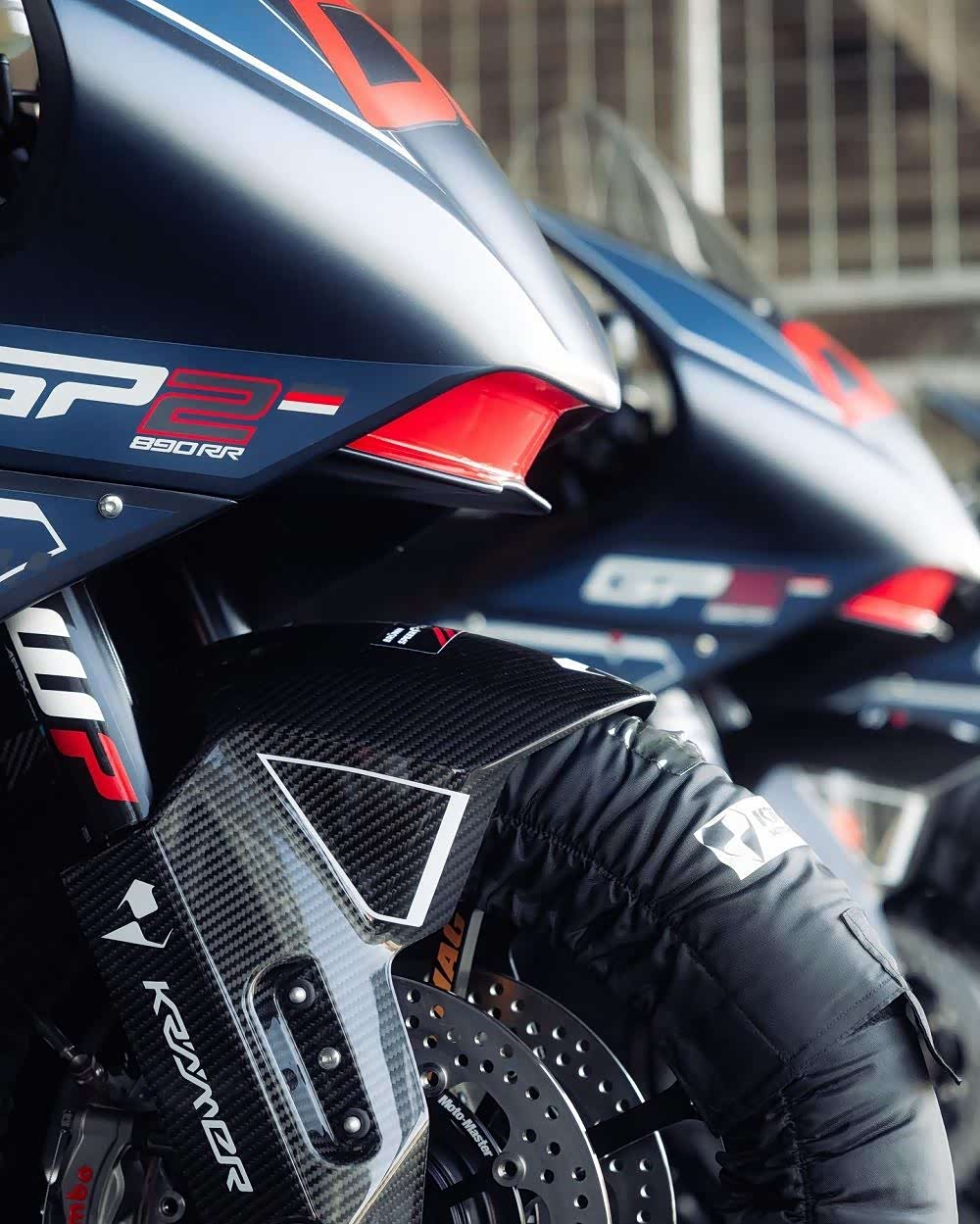 透过引擎内部零件调教,让引擎的最大马力多了8hp在悬挂上,GP2-890RR采用了全可调的WP Apex Pro 7543前叉,后悬挂则是采用全可调的WP Apex Pro 7746避震器。 制动部分,前刹使用了290mm的双碟盘搭配Brembo Stylema卡钳配置,后刹则是使用230mm的后碟盘配置。 为了在赛道上能够有更好的秒数成绩,整辆车的重量只有142公斤重。