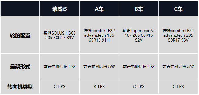 在自主品牌紧凑型家用车领域, 荣威i5(参数|询价)的销量口碑一直不错。全新荣威i5已经上市,售价为6.89万元起,我们也对其做了一次对比测试,挑选的竞品为A、B、C三款经典的紧凑型车,其中B、C为自主品牌同级代表车型,A车为合资同级标杆型车型。