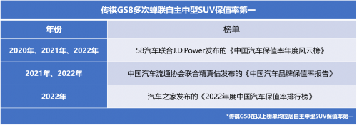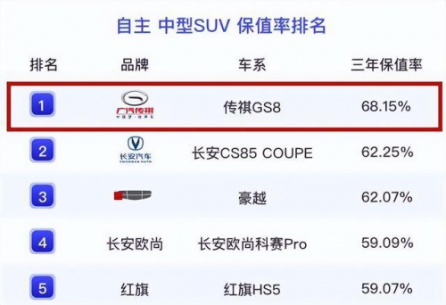 近期,根据中国汽车流通协会和精真估联合发布了《2023年度上半年中国汽车保值率报告》,其中在中型SUV保值率榜单中,GS8的三年保值率再次斩获自主第一名,并将宝马X4、雷克萨斯NX等豪华品牌车型甩在了身后。