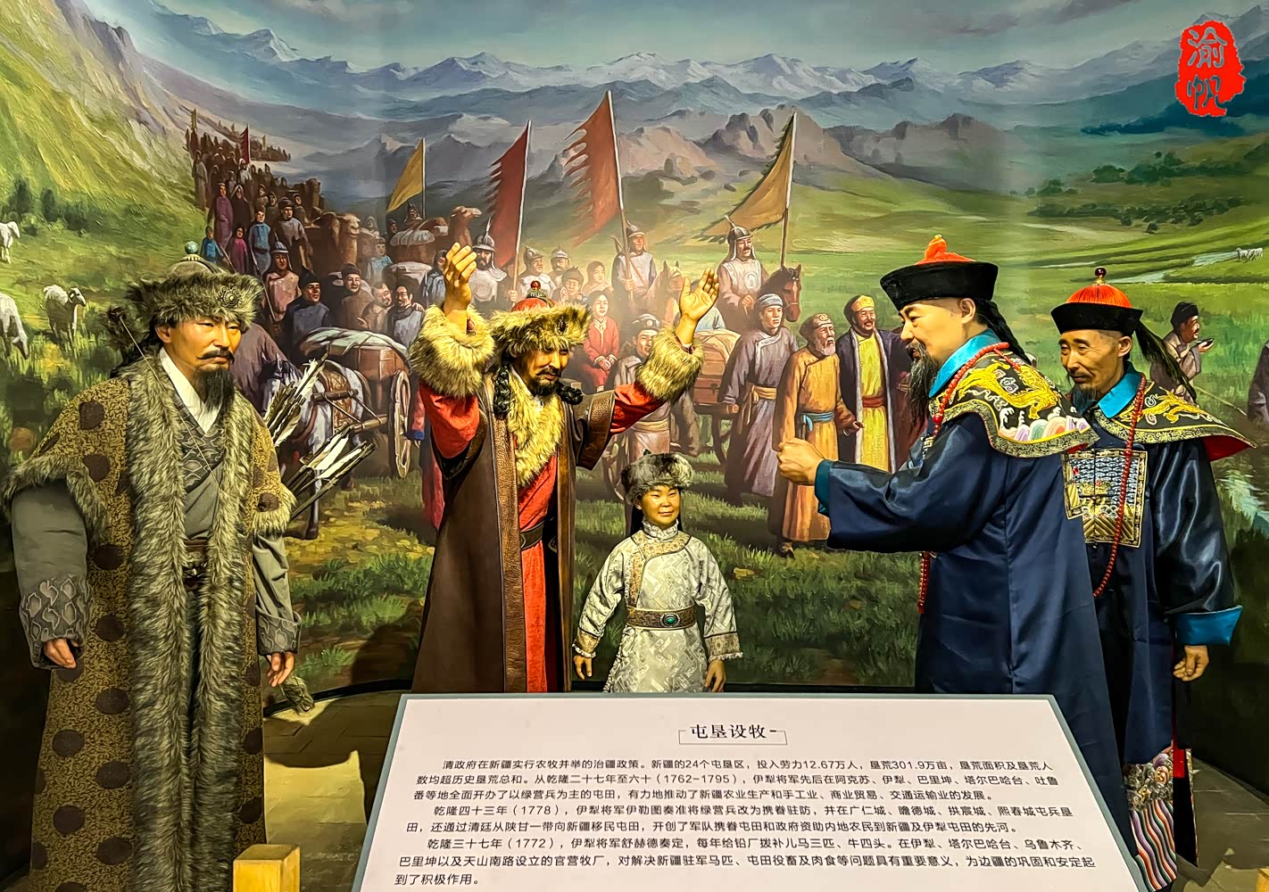 进入将军府之后,右边有一个将库府历史陈列馆,里面详细介绍了伊犁将军府的历史,清朝于公元1757年出兵伊犁,平定了天山以北的西蒙古准噶尔部落,后来又出兵莎车,最终完全统一了新疆。并在天山南北各大城市驻扎军队,其中尤以伊犁为多,公元1762年设立总统天山南北的最高军事行政长官伊犁将军,将军府设在惠远城,成为新疆的政治中心。