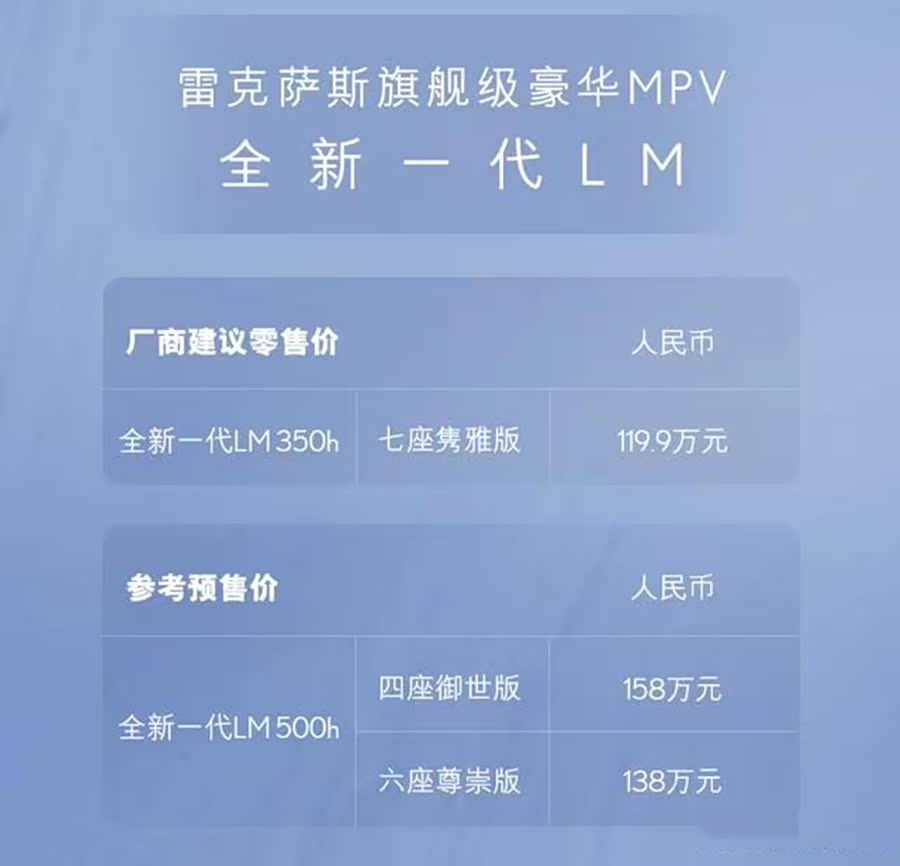 继全新一代 雷克萨斯LM(参数|询价)在今年4月份的上海车展中全球首发之后,8月7日,新车在国内正式上市,共推出3款车型。其中,全新LM 350h七座隽雅版的售价为119.9万元,全新LM 500h开启预售,六座尊崇版的预售价为138万元,四座御世版的预售价为158万元。