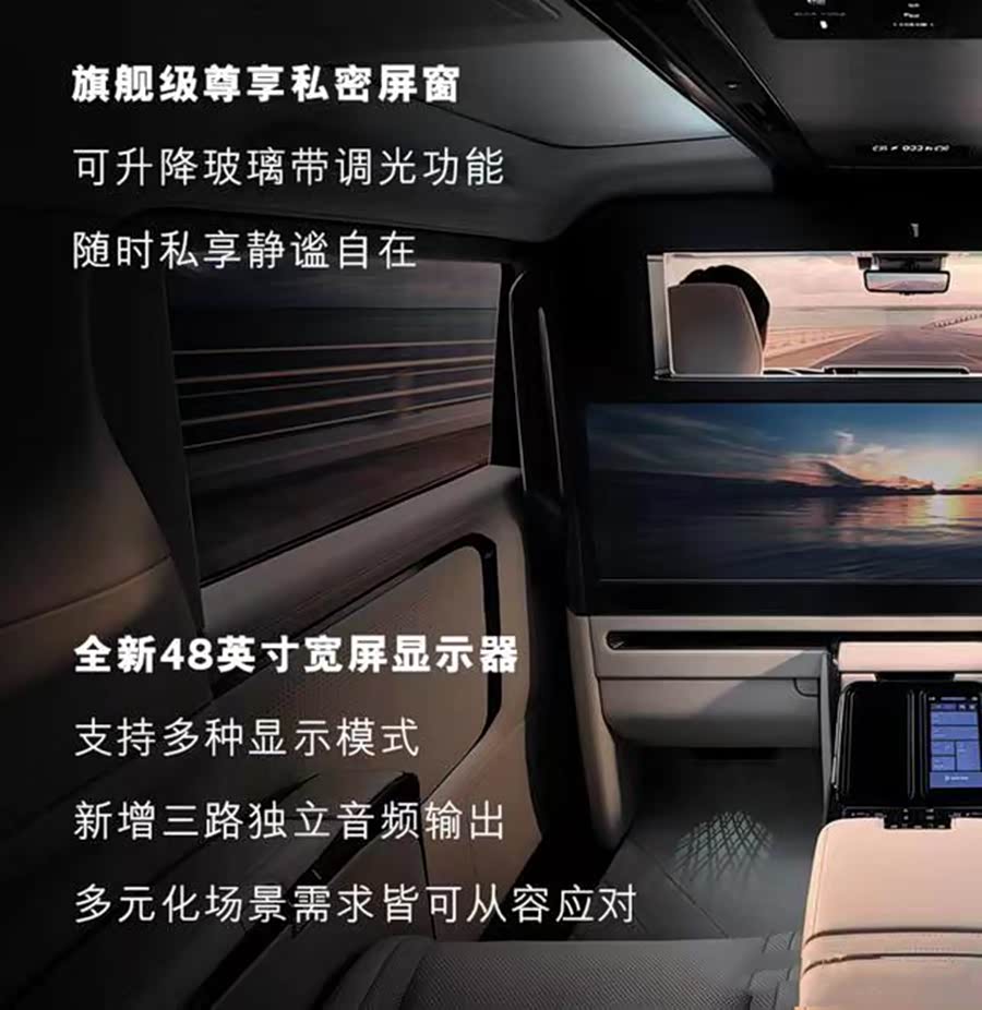 此外,还拥有“后排舒适”模式,并提供定制化内饰和丰富的舒适性配置。就拿四座版车型来说,便配有脚托加热、后排舒适模式、23个扬声器的马克莱文森音响系统、64色氛围灯、后排48英寸娱乐显示屏、电动尾门、前排座椅加热/通风、雷克萨斯智能安全系统LSS+ 3.0、主动降噪系统ANC等。
