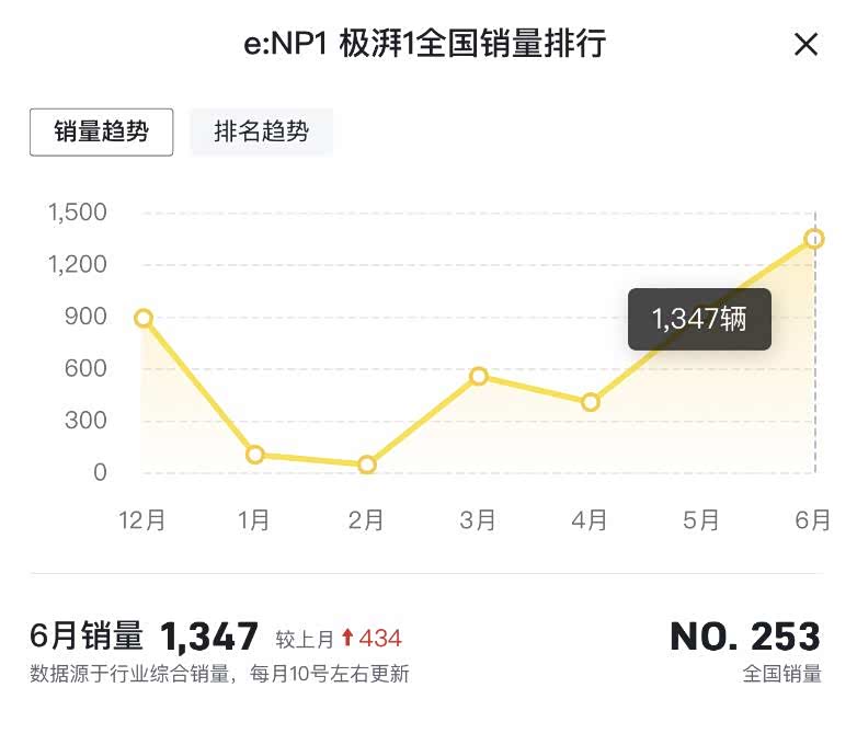 行业综合销量数据显示,2023年1-6月份,极湃1的单月销量分别为102台、44台、554台、404台、913台、1347台。