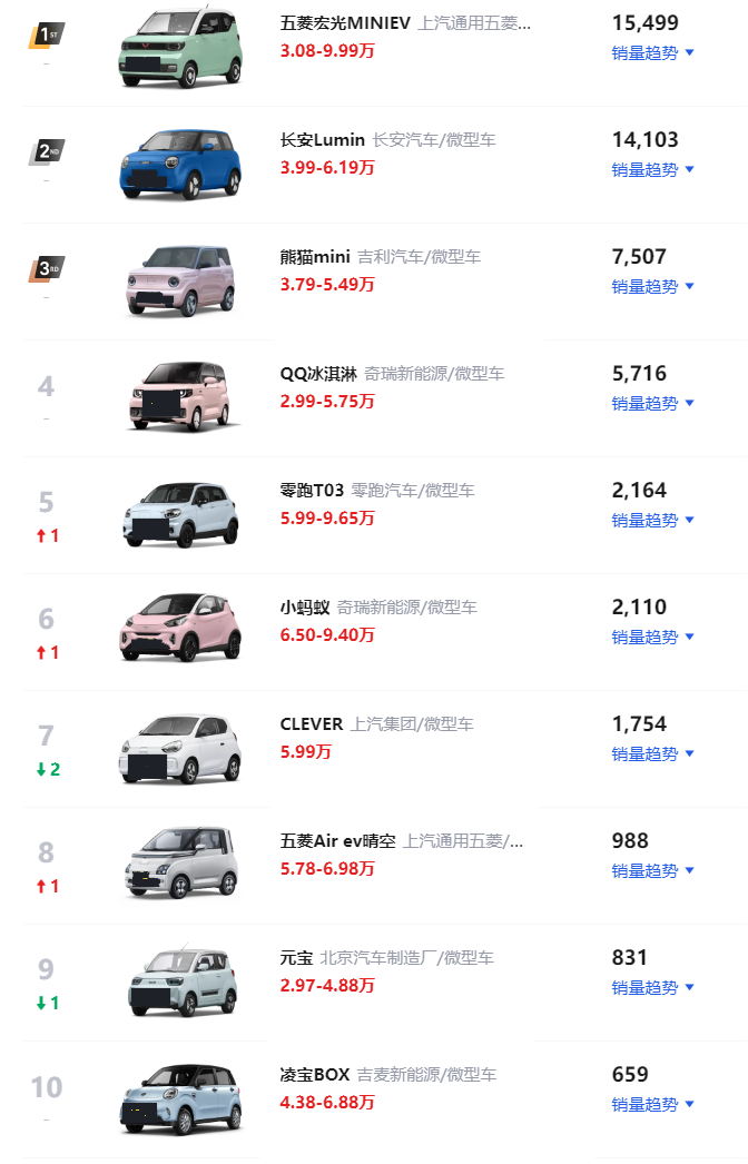 五菱 宏光MINIEV(参数|询价)仍旧排名第一,可是销量却不复以往。