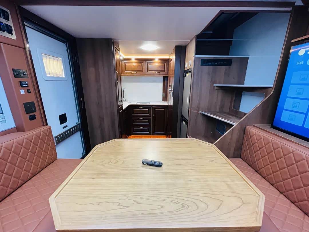 进入车内,整车采用多层板加实木板家具、实木装饰条(美式风格家具)+柚木地板,彰显高端典雅;沙发会客区+顶部电动吊床+厨房+卫生间的布局,规整布局让内部空间得到最大化利用更加宽敞。