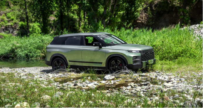 车身侧面,探索06采用了大量平直硬朗的线条勾勒整体轮廓,同时通过前低后高的腰线塑造出俯冲的姿态和稍微下坠的车顶线条,呈现出极具肌肉感的轿跑SUV元素,与传统硬派SUV略有不同。