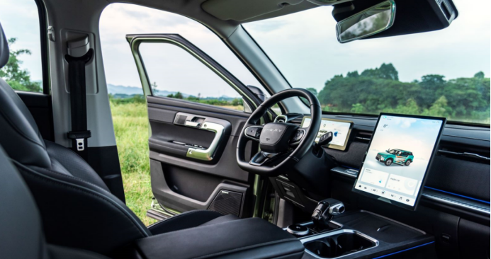内饰方面,新车采用了极简的设计理念。车内配备了竖置的大尺寸中控液晶屏、全液晶仪表盘、三辐式多功能方向盘以及造型独特的换挡杆。中控台线条平直,两侧的空调出风口设计成了菱形,车内没有冗余的物理按键,大部分功能都集中在中控屏幕上,整体外观既具有科技感又硬朗。