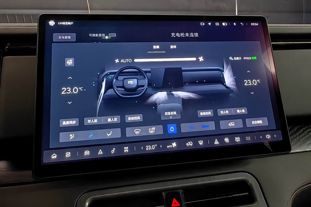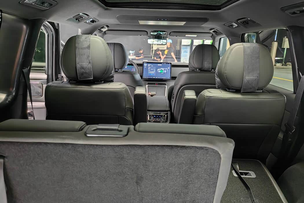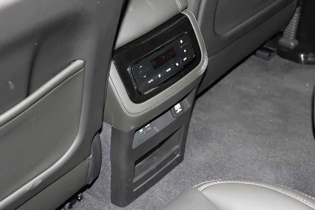 车内还提供了双无线充电面板和双杯架,第二排配有顶部液晶屏和头顶侧方空调出风口。第二排座椅同样支持多角度电动调节,并且第二排纯平的地板布局以及分区空调的设计,足见对后排乘客的照顾。