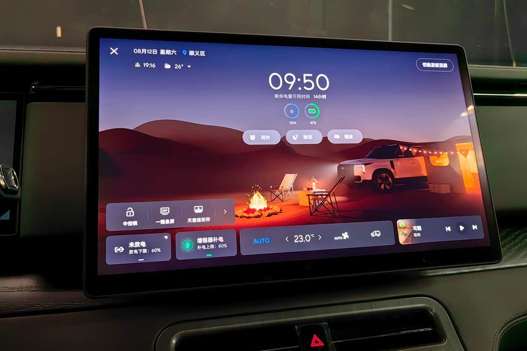 同时还能支持一键露营模式,作为一款主打轻越野露营的SUV车型,极石01在露营模式下可以通过中控大屏设置闹钟、睡觉、铺床等模式,触控式遮阳帘功能,还能实现一键开闭天窗,户外露营体验更好。