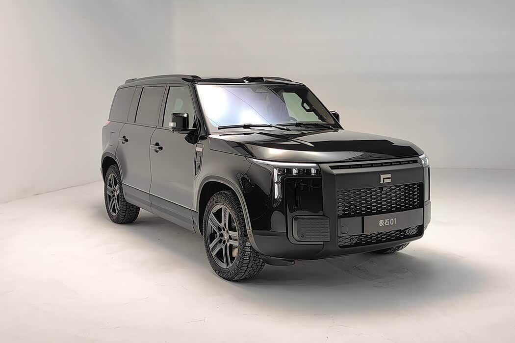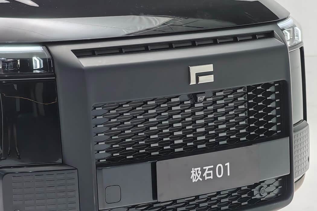 从造型设计上来说,极石01整体看起来有着新势力品牌的大气稳重产品特点,硬派越野的造型设计风格,与路虎卫士、仰望U8等车型有着相似之处。新车前脸采用大尺寸进气格栅,格栅处加入黑色饰条进行点缀,中间是其全新设计的logo。