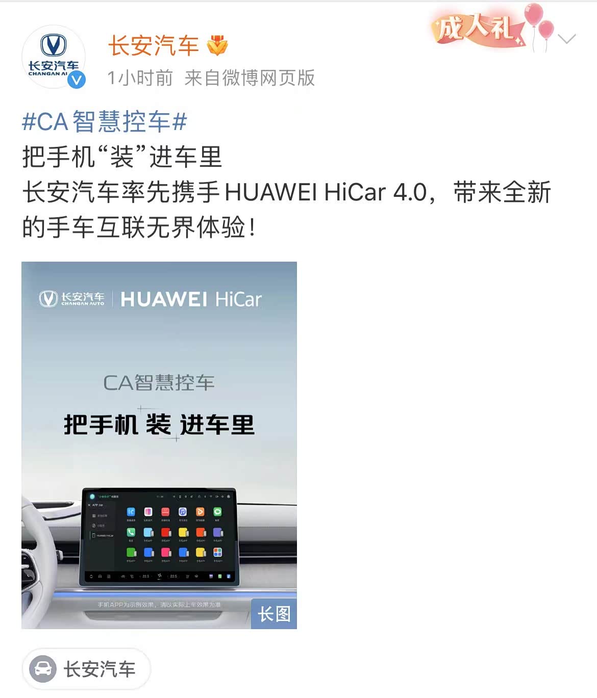 长安汽车官宣:率先搭载华为HiCar 4.0