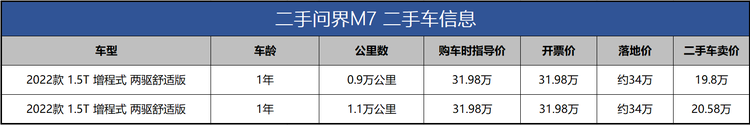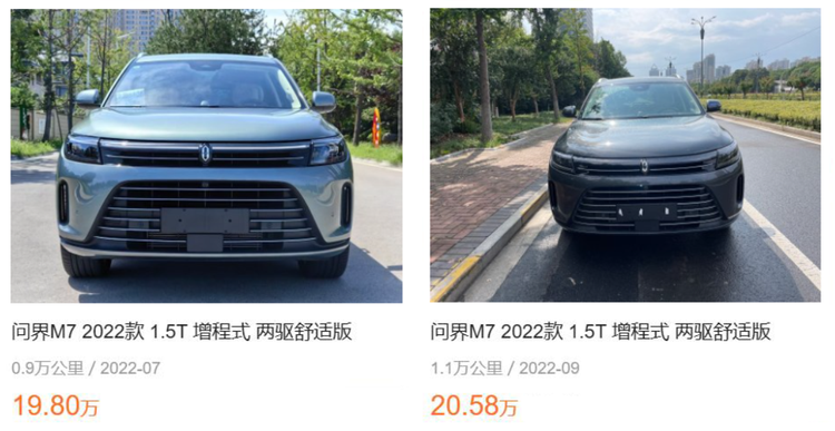 根据我们调查来看,由于上市时间不算长,目前二手车市场上AITO问界M7全部都是2022款车型,车型大多以两驱舒适版为主,也有少部分是两驱豪华版,在具体车源方面,车龄1年、里程数在1万公里左右,二手车价格普遍在20万元左右,一些车况较好,里程数更少的“准新车”二手车价格会卖到22-23万元。相比问界M7去年上市时超过30万元的价格,1年时间产品贬值了差不多有10万元。