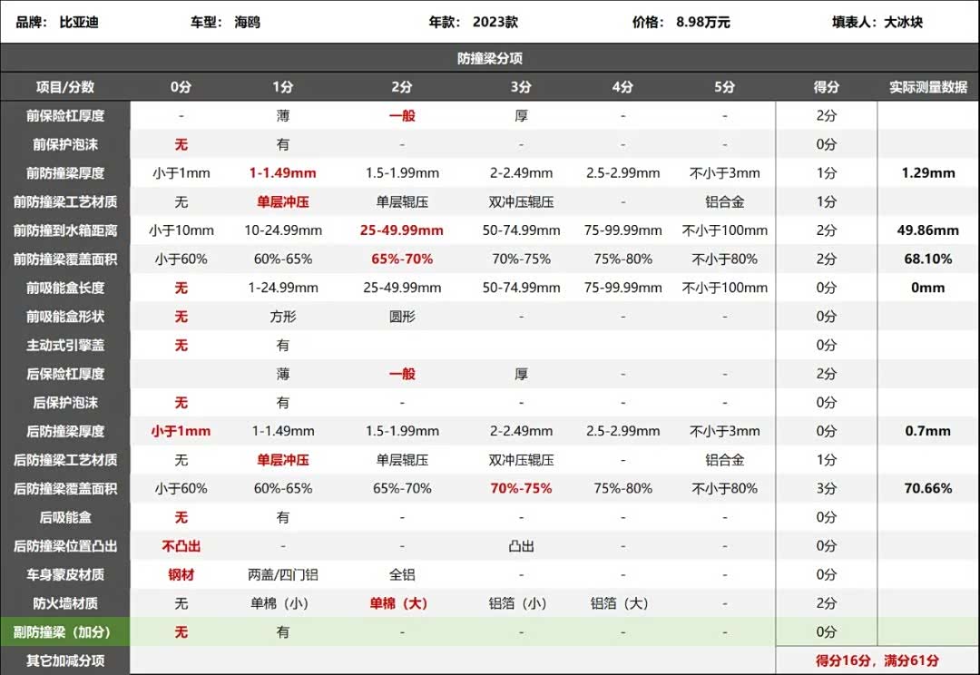 这辆比亚迪海鸥前后都有防撞梁,尽管前后都是单层冲压钢板,厚度一般,也不是热成型钢,但起码还有。不过,前后都没有吸能盒,可能会让提高修车成本,也会影响二手残值。