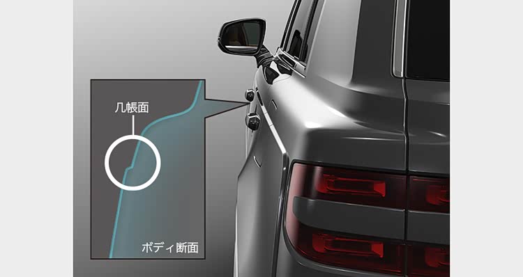与主格栅一样,车身侧面也有独到的技术细节,丰田称其为「几帳面」,反应在实际中即:贯穿车身的腰线与车身上部并不在一个平面上,而是有一个外凸的小台阶。