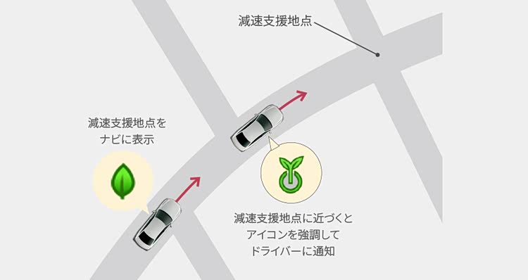 为提升燃油经济性,新车提供一项名为”减速支持模式“,即导航系统会学些每日的驾驶行为,将反复减速、停车的地点标记为“减速支持地点”。此后,在用车过程中,当车辆接近“减速支持地点”时,导航系统会通过发送信息提醒方式通知驾驶员,可以不再加速,从而提高燃油经济性。