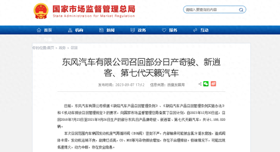 近日,东风汽车有限公司向国家市场监督管理总局备案了召回计划,自2023年12月30日起,召回2018年7月23日至2021年9月26日生产的部分东风日产品牌 奇骏(参数|询价)、新逍客、第七代天籁汽车,共计1,188,020辆。这是东风日产有史以来最大规模的召回行动,也是国内汽车市场近年来最引人注目的召回事件之一。