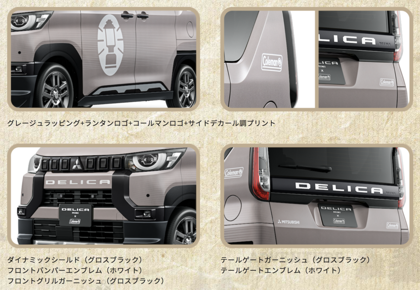 Coleman 特别套件内容包括 Greige 专属车色及贴饰(车侧露营灯、条纹装饰与 D 柱/尾门上 Coleman 徽饰),搭配原厂推荐的黑色水箱护罩、尾门饰板,并将车头尾 Delica 字样施以白色涂装,共同打造出不容错认的特别样貌,选配价格则为 870,540 日圆,约台币 19 万元(1人民币:4.3新台币)。