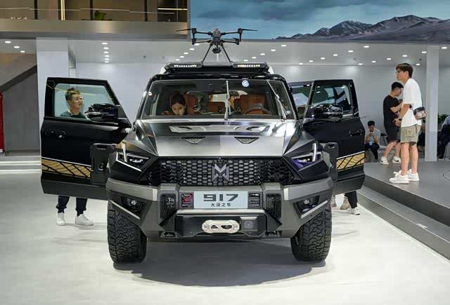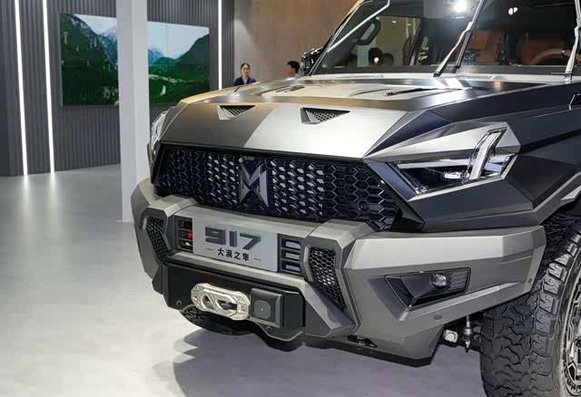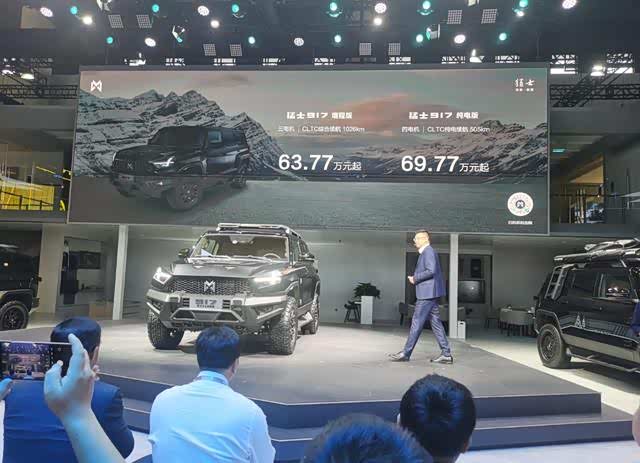 在2023年的成都车展上, 猛士917(参数|询价)正式上市,新车在动力方面不仅有纯电,还有更加实用的混动两个版本,其中增程搭载3电机,CLTC综合续航1026km,起售价63.77万元,纯电搭载4电机,CLTC续航505km,起售价69.77万元。作为一台硬派越野车,猛士917是M TECH猛士智能越野架构首发车型,也是目前市面上少有的性能强悍的新能源硬派越野车。