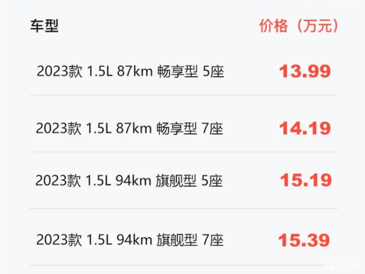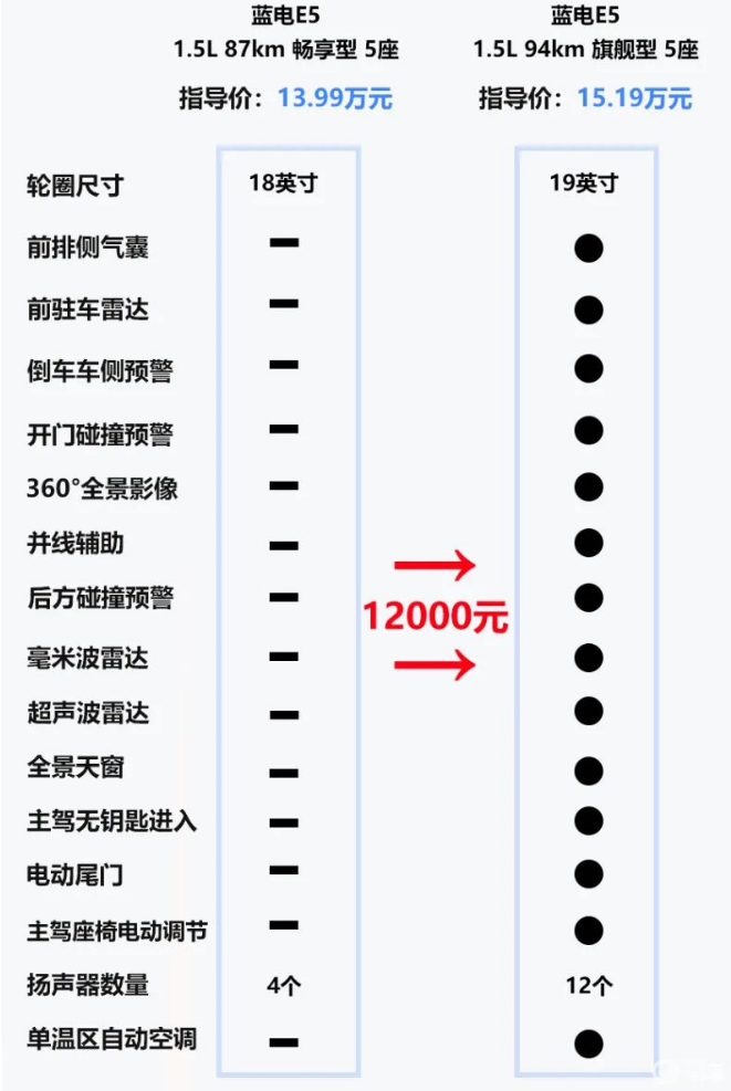 蓝电E5的这款车定位是一款插混中型SUV,其共推出了两个配置版本的车型,分别是蓝电E5 2023款 1.5L DE-i 畅享型和蓝电E5 2023款 1.5L DE-i 旗舰版,官方指导价为13.99万和15.19万元,同时这两个版本的车型还都可以选装7座版,售价方面再增加2000块钱,其中七座版车型的指导价分别为14.19万和15.39万。在这样的价格区间里,想要入手一款插混、中型SUV、大7座布局的车型,蓝电E5算是市场中的独角兽,展现出极高的性价比。