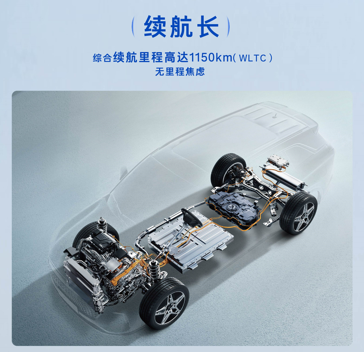 另外这套混动系统采用了比亚迪的DM-i技术。它主要依靠电驱提供动力,在城市路况下以电力起步,发动机平稳工作,提供动力电机的电能,并将剩余电能储存在电池中。在需要更大动力的情况下,发动机和电动机可以同时提供动力。同时,在电量充足时,蓝电E5可以完全以电能驱动。采用了P3结构,集合了串联、并联和串并联的特点,使其在动力输出和燃油经济性方面表现出色。蓝电E5的WLTC工况下的综合亏电油耗为5.5L/100km,其WLTC 纯电续航为 94km,可实现全工况电驱占比超 80%、市区工况电驱占比 99%,综合续航为 1150km。
