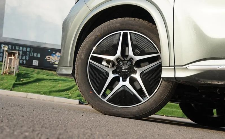 蓝电E5的轮毂采用双色设计,特别是银色部分采用了双五辐设计,远看有五角星的形状,为车辆增添了一份动感和时尚感。这样的设计能够为整车外观增添一种运动感。除了轮毂的设计,蓝电E5的轮毂上还有塑料装饰罩的设计,不仅增添了车辆的美观,还具备降低风阻的作用。这种细节设计不仅提升了蓝电E5的外观质感,还为车辆带来了一些实用性的优势。