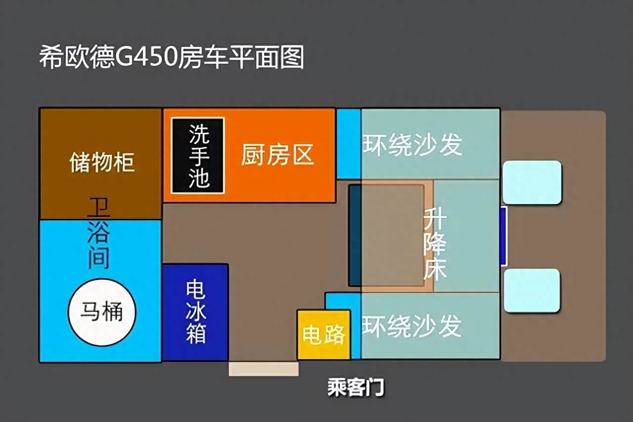 这款希欧德G450房车有一个不同的亮点,它的设计思路不是直接在重卡底盘上制作上装,而是江淮与希欧德联合设计底盘,进行针对性改装,直到完全适配房车上装,并且整备质量还做到了仅有8.5吨。