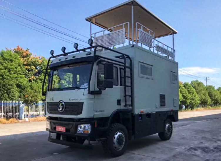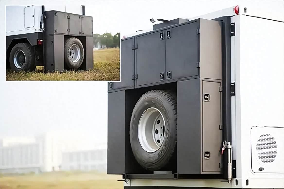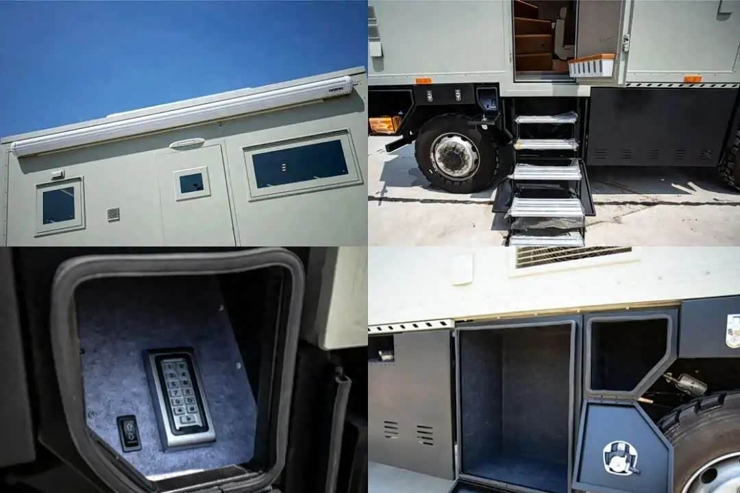 动力方面,搭载8.7T涡轮增压柴油发动机,最大输出320马力,峰值扭矩1400N.m,并且是全时四驱,匹配三把差速锁,后桥还采用气囊悬挂设计;水路方面,配备402L净水箱、72L灰水箱;电路方面,提供24V/6000W充电逆变一体机、24V1000Ah磷酸铁锂储能电池、1350W太阳能板和外接充电系统等。