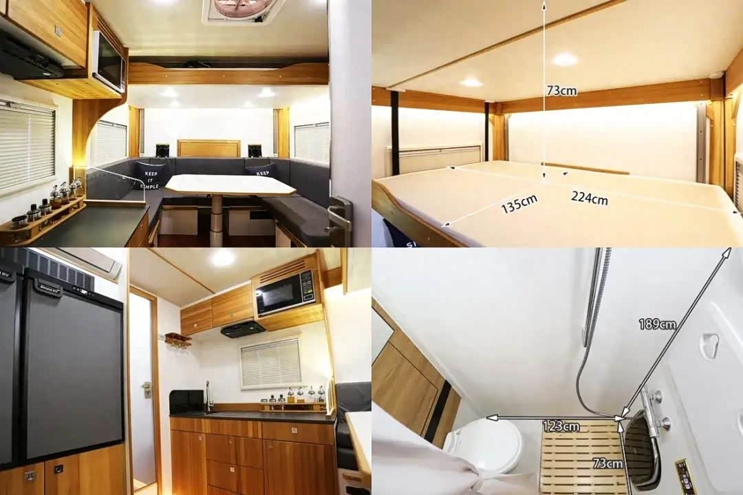 内部空间,应用了大量的红橡实木材质,有对卡座沙发、气动升降餐桌、组合式橱柜、横置上下床、24V格力变频空调、电磁炉等配置,还有丰富的储物空间;卫生间采用干湿分离设计,配备了赛特福德马桶、洗手池、梳妆镜、换气扇、淋浴花洒等,还有大宇3kg洗衣机,免去了手洗衣物的麻烦,提高旅途舒适性。