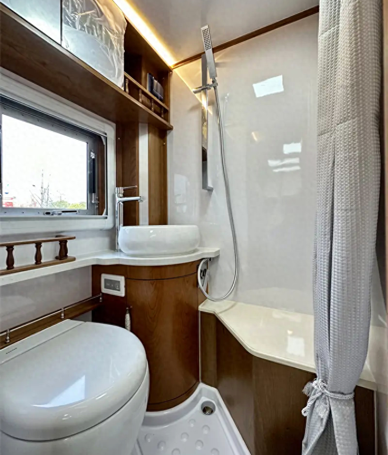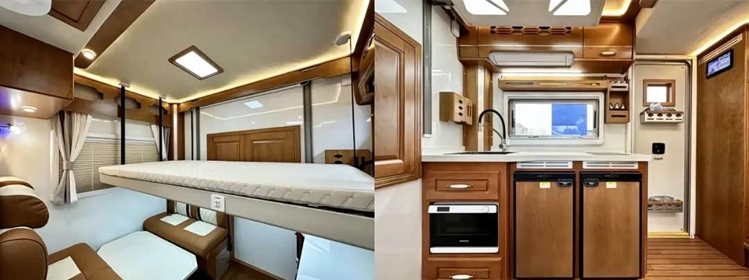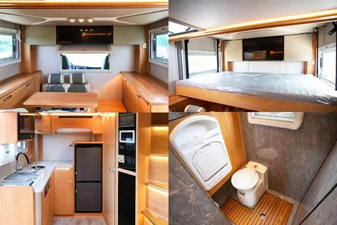来到车内,布局与前三款房车不同,一边是会客区和厨房区,另一边则是卫生间和睡眠区。