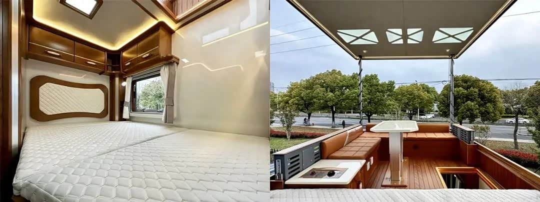 惊喜的是,这款房车还在尾部布置了独立空间的后置床,尺寸1900*1200mm,两个人休息完全没问题。同时,顶部露台也有,依旧是环形座椅+桌板,还有一个烧水壶。