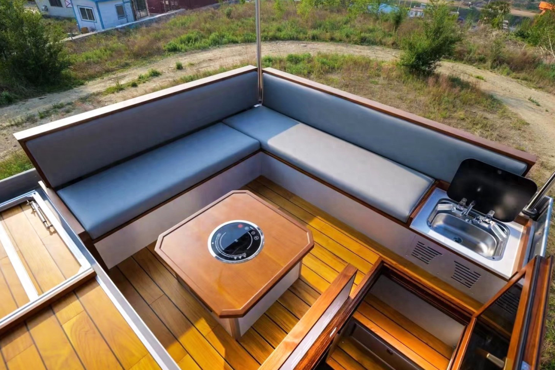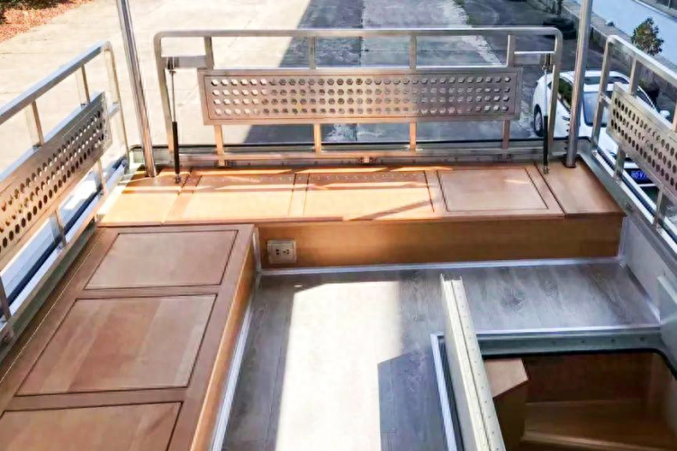 同样,这款房车的车顶也设置了露台,除环形座椅外,还配备了洗手台、电磁炉,车友可以在上面打火锅,增加旅途乐趣。