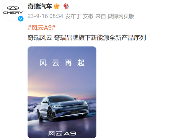 车家号·0浏览·2023-09-16 11:19 · 广东2023年9月16日,奇瑞汽车通过官方微博发布了新能源全新产品序列——奇瑞风云,同时还公布了新序列首款车型“风云A9”的渲染图。根据我们掌握的最新消息,奇瑞风云A9有望在今年年底正式亮相。