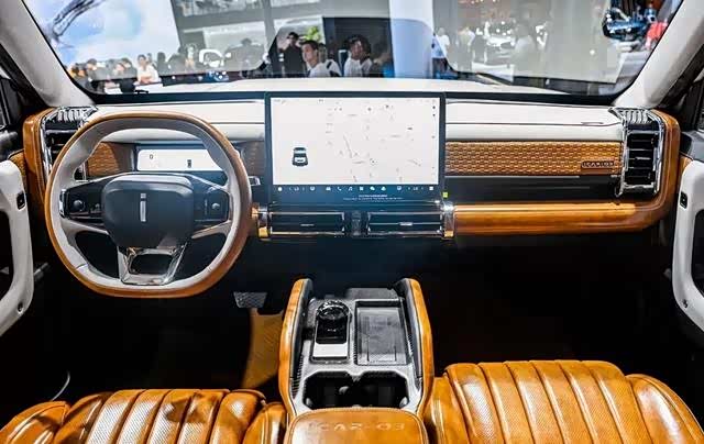 内饰方面,iCAR 03改装版的整体造型和普通版一致,主要是装饰部分的调整。使用了大量古铜色的皮质装饰,看上去古色古香,给人一种返璞归真、回归自然的感觉。这种古朴风格让人联想到旅行者乘坐马车穿过山林的场景,充满了诗意和浪漫情怀。