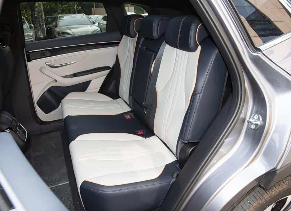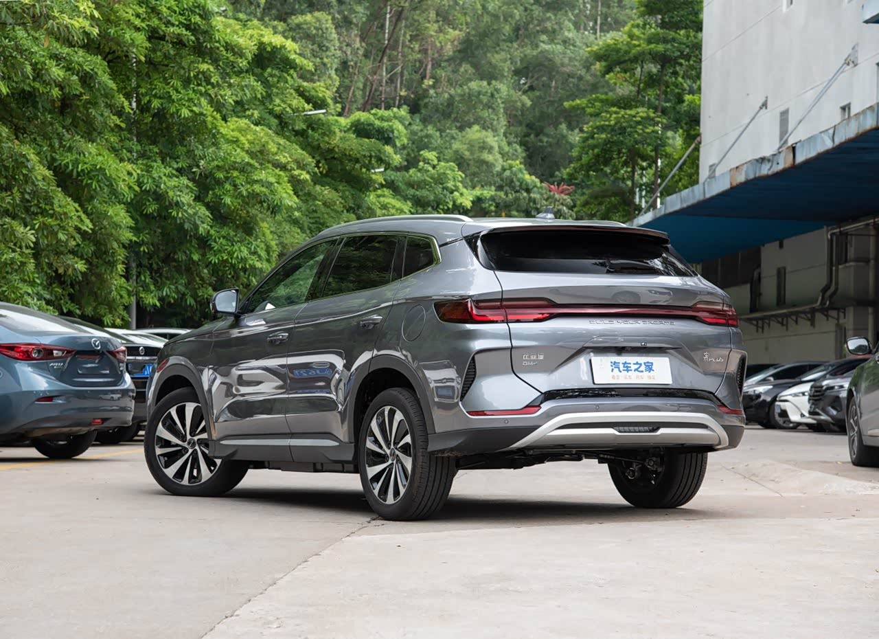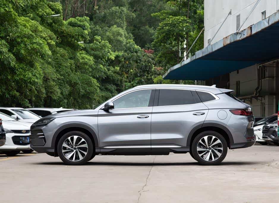 侧面来看,标准的紧凑型SUV风格设计,和那些跨界车不同,新车造型偏向于稳重。腰线不太规则,但贯穿车身,C柱处隆起较高,突出力量感。车顶有行李架,底部是条辐式结构轮毂,搭配的也是传统的门把手。新车侧面设计和燃油车一样,很难看出这是新能源车型。尾部和前脸一样,有着不错的层次感,顶部是小尾翼,下面是贯穿式尾灯,底部依旧有层叠样式的梯形结构,并加入了银色饰板装饰,没有了尾排,整体看起来更加厚重。