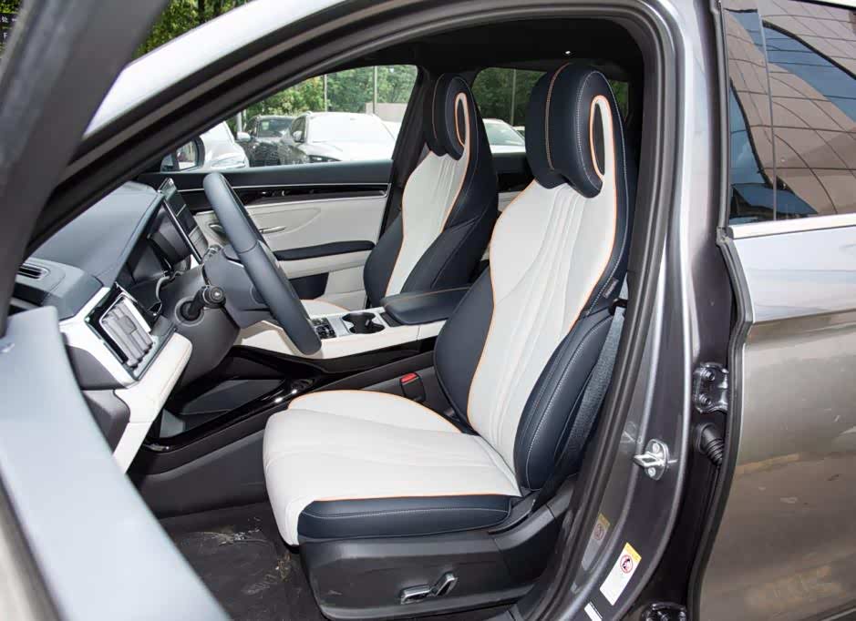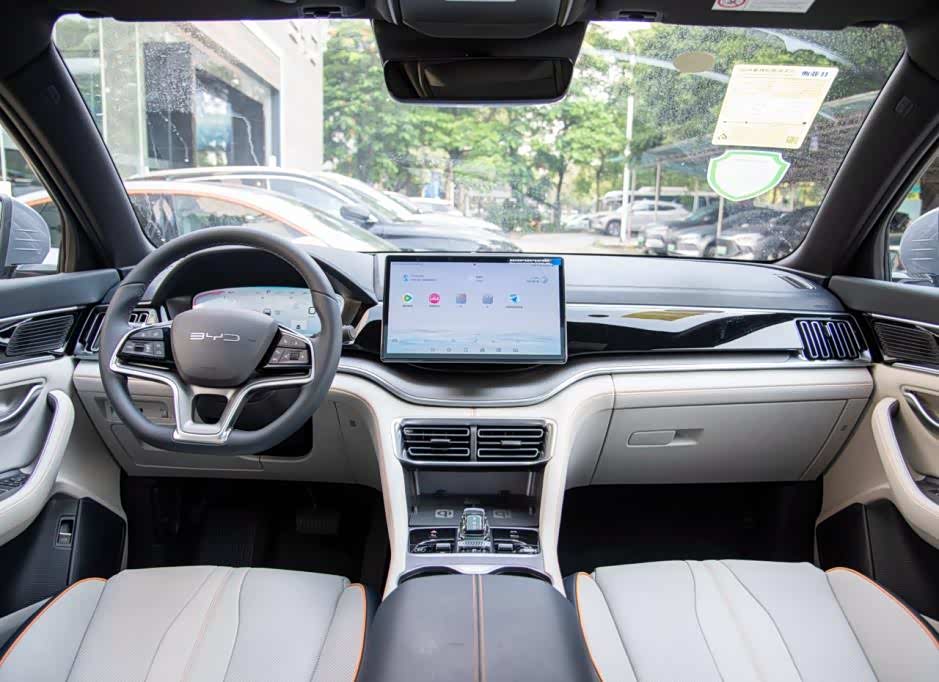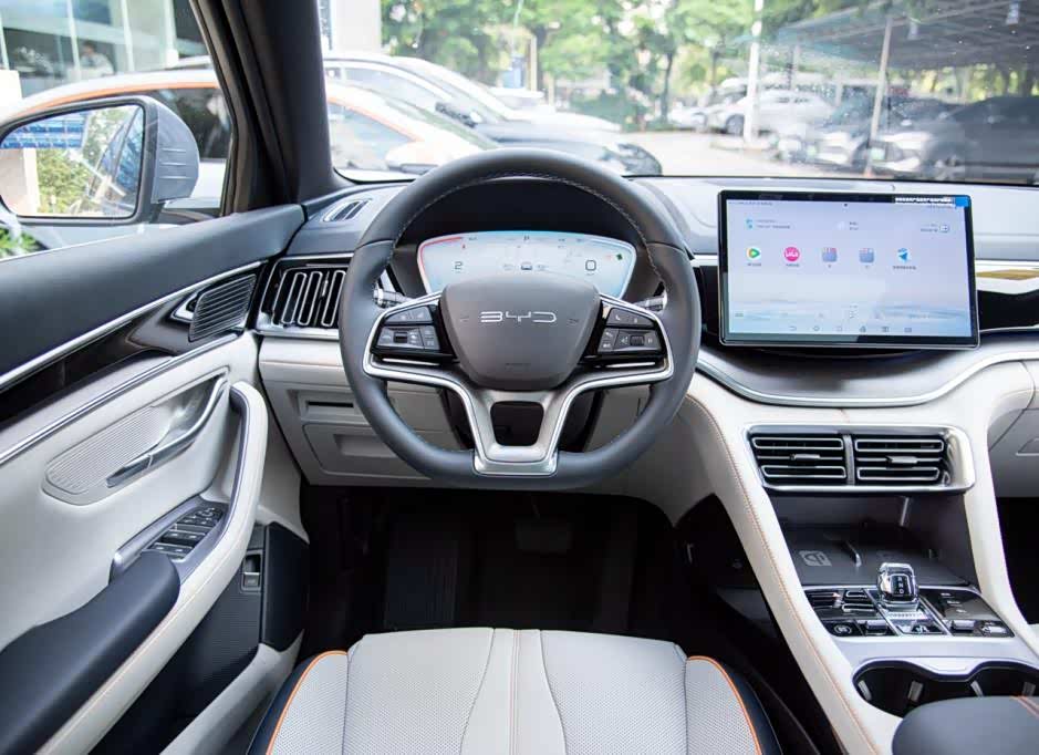 内饰部分,新车内部的氛围感还不错,采用了撞色的设计,同时缝线采用高亮颜色,一点也不沉闷。科技方面,这款车配备了三辐式方向盘,上面有很多功能按键,下面是液晶仪表盘,还有一块可以宣传的中控屏,搭配的是电子档把,整体的质感还不错。车内很多地方LOGO也采用了BYD三个字母,辨识度提升。