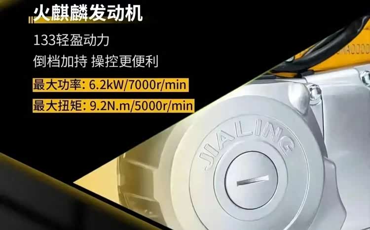 它实际排量124 cc,最大功率6.2KW,最大扭矩9.2N·m,最高设计时速60km每小时,并配套有倒车挡变速箱,自动离合器。