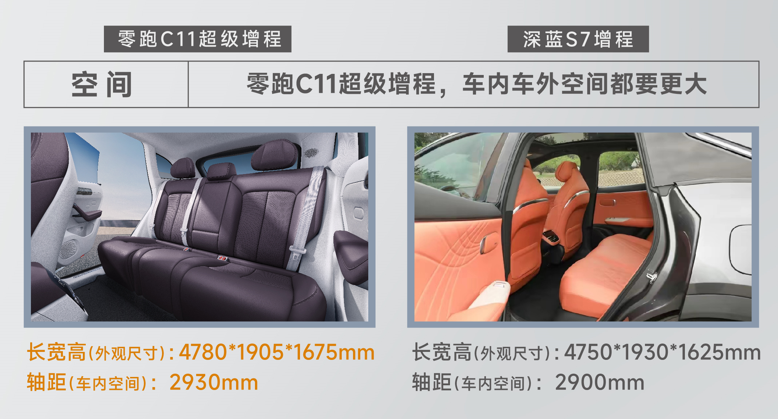 总体来看,零跑C11超级增程200舒享版在空间方面表现出色。此外,从空间的充分利用和灵活性角度来看,零跑C11超级增程也是一枝独秀,其轴长比高达61.3%,明显超越深蓝S7增程,确保了更宽敞、更灵活的空间布局。