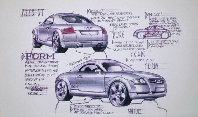 TT诞生的故事: 奥迪TT(参数|询价)之所以出现,并不是一个潮流,也不是公司规划而来的产品,而是源自于设计师弗里曼·托马斯 (Freeman Thomas) 闲来无事打发时间的涂鸦小灵感。1994 年 3 月,托马斯与奥迪首席设计师 J Mays 一起在因戈尔施塔特工作。托马斯刚刚与大众概念车合作,最终成为新甲壳虫,他受到启发,进一步推动了这种图形形状的想法。以两个轮子以柔和的弧线连接,形成一个俯冲的驾驶室,两个圆上面有一个半圆的简单性,而在托马斯的同意下,梅斯将其直接交给了奥迪公司的开发主管约瑟夫·帕夫根(Joseph Paefgen),让这个甚至不是在画纸上的涂鸦变成了奥迪 TT 的草稿涂鸦。毕竟当年的奥迪可基本都是线条硬朗的车型,这圆鼓鼓的玩意,还是一台双门跑车,毫无疑问一瞬间就吸引住了大家的眼球。