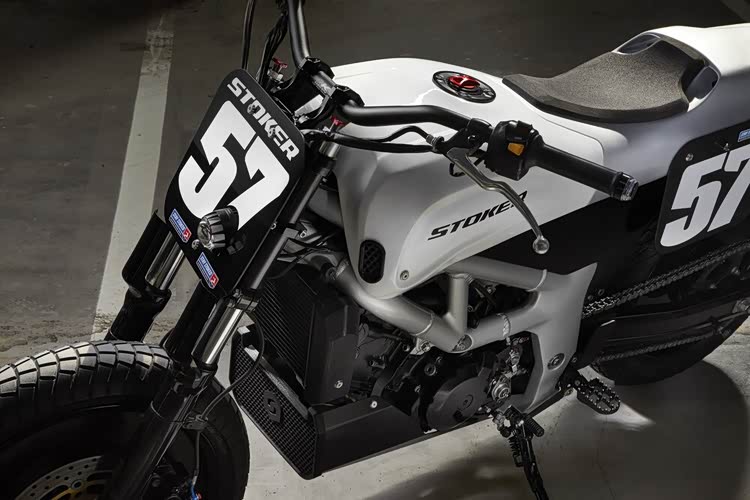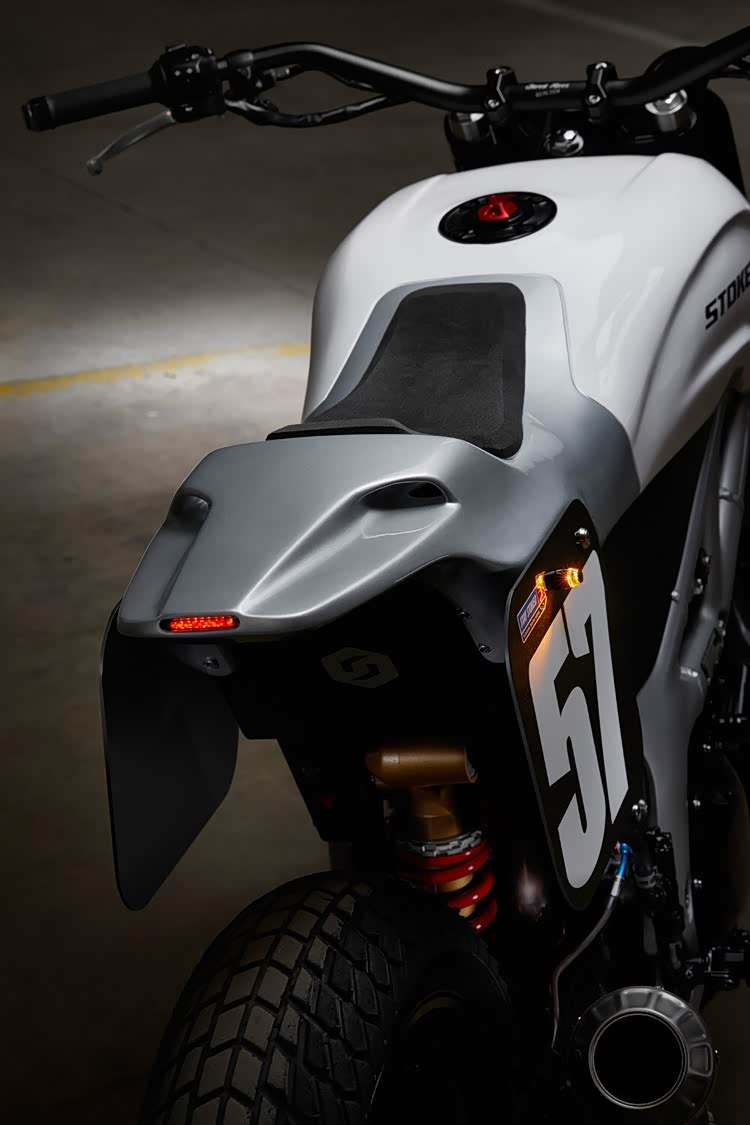 定制车身上是一块薄薄的泡沫鞍座,两侧是可拆卸的追踪器风格的编号板。所有这些配件都安装在经过大幅修改的副车架上,每侧都被铝板整齐地包裹。人们可以看到另一块手工制作的板子包裹在副车架的底部,以防止任何路面碎片进入内部存放的电子设备。