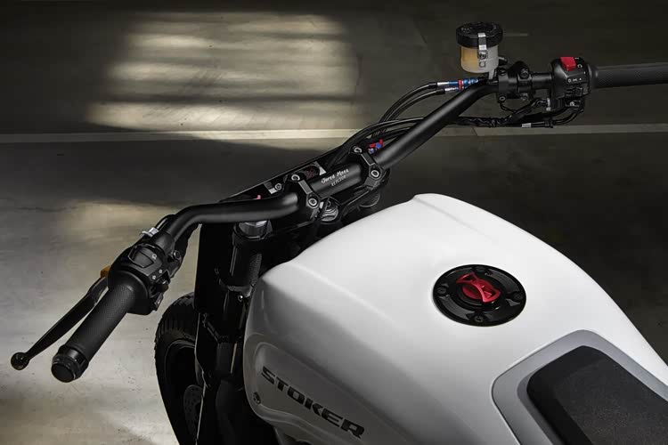 在驾驶区域,你会看到一个低矮宽大的Neken把手,非常适合平板追踪器,但也有一个来自Motogadget的数字速度表。同一个德国电子品牌提供了一对把手末端的转向信号灯,这些都配有一个新的带有外部电缆的油门模块。完成驾驶员视野的是一个精致的CNC机械加工的油箱盖。