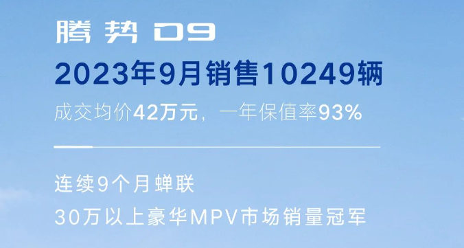 根据数据显示,在腾势D9的增换购用户中,来自传统燃油车豪华品牌的用户占比高达50%,且成交均价超42万元,年保值率高达93%。截至10月初,腾势D9已连续9个月蝉联30万以上豪华MPV市场销量冠军和新能源豪华MPV市场第一,并揽获诸多行业奖项,用实力夯实“中国新能源豪华MPV价值新标杆”的地位。