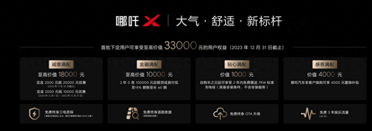 四大满配用户权益、两大个性选装包的加持,则让哪吒X的标杆实力,如虎添翼。哪吒X为首批下定用户推出至高价值33000元的满配用户权益,11月底前下定,2000元定金最高可抵20000元,12月份,定金两千元抵一万元优惠。此外,还有两年零息十万定额贷或首付低至15%的金融满配权益、购车之日起可享受两年内免费赠送7千瓦标准充电桩的贴心满配权益、老客户4000元购车置换补贴的感恩满配权益,以及诚意满满的服务承诺,包括免费终身三电质保、免费终身道路救援、免费终身OTA升级、免费3年每月5G的娱乐流量。