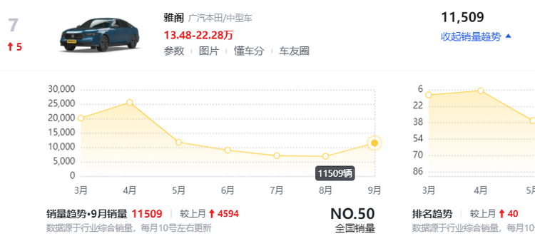 说了这么多,其实现如今的本田雅阁,依然是大多数消费者在选择中型车时绕不开的一辆家用车。毕竟从8月份和9月份的销量变动下可以看出,还是有不少消费者比较认可十一代雅阁的改变,虽然说新车的前脸造型有些“格格不入”,燃油版的动力系统也没有任何新意,但是只要给到足够合适的价格,雅阁还是能够凭借自身多年以来打下产品力,在同级市场当中站稳脚跟。那么,看到最后,大家对于十一代雅阁这款车有何看法?十月份的雅阁又会给出怎样的销量成绩?欢迎在评论区留言讨论。